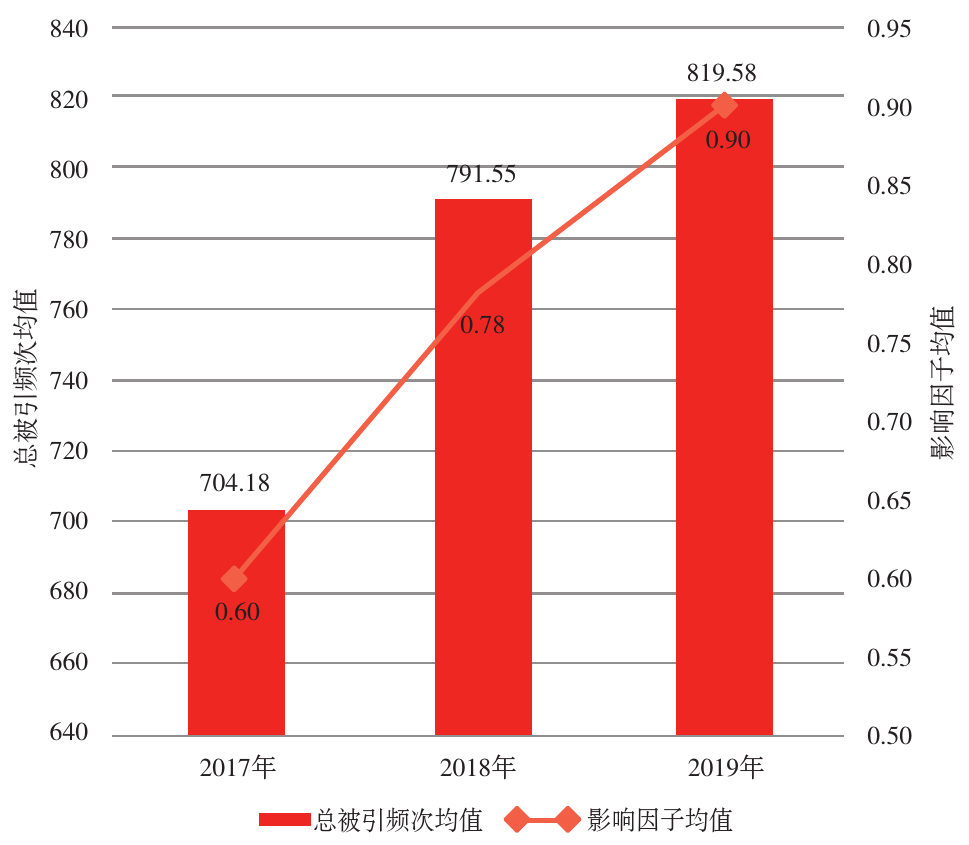 图3  2018—2020年数学领域17种高质量中文刊的影响因子均值和被引频次均值