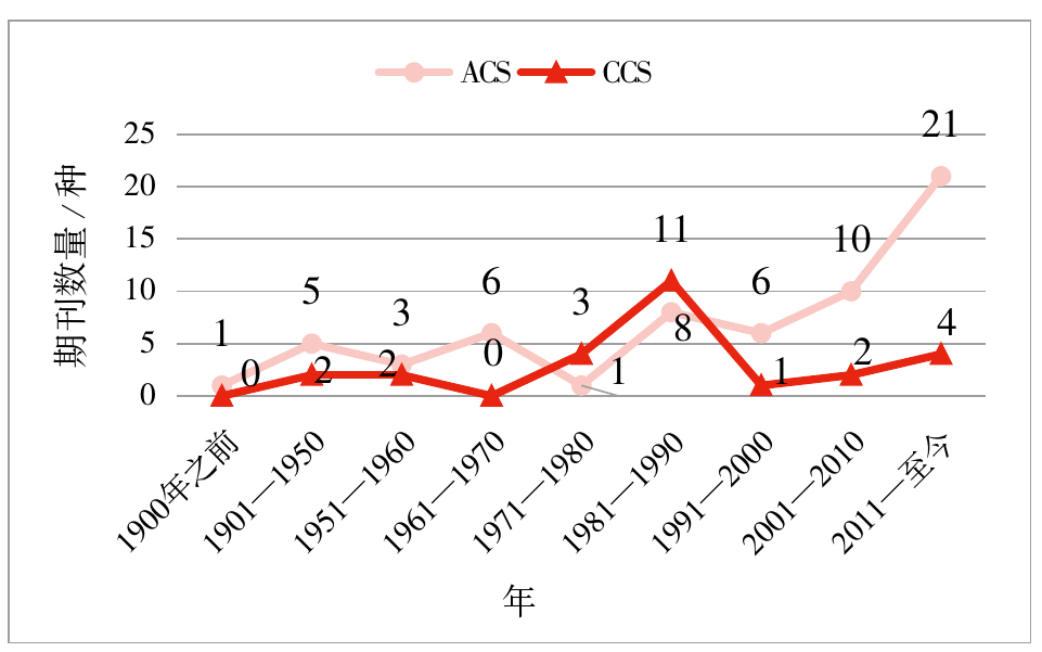图1  美国化学会(ACS)和中国化学会(CCS)不同年代创刊的数量