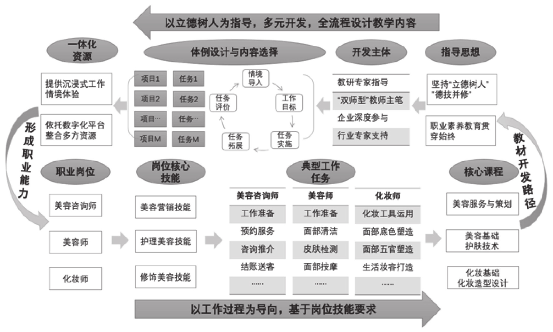 工作手册式教材作为一种新形态教材,凸显了职业教育的类型特征,是职业教育教材改革的重点方向。文章在回顾国内工作手册式教材开发相关理论和实践的基础上,以北京师范大学出版社中职美容方向专业课教材为例,深入剖析工作手册式教材在开发主体、内容设计以及融媒体建设方面的有益探索,以期为新时代职业教育教材的发展提供一定借鉴。