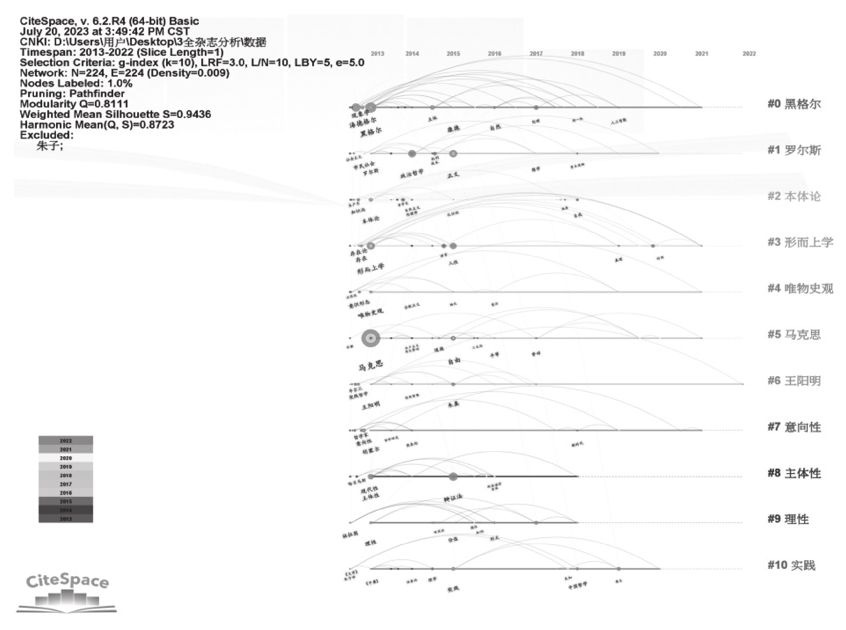 新时代呼唤哲学的创新,推进中国式现代化需要哲学发挥理论引领作用。2013—2022年这十年,哲学领域坚持问题导向,积极推动知识创新、理论创新与方法创新,这在承载和引领哲学思想创新平台的哲学期刊中有突出的表现。文章以哲学研究杂志社6种哲学期刊为样本,利用定性与计量研究,对十年间哲学期刊的特色栏目、重点文章,关键词的词频、中介中心性、知识聚类及时间线等数据进行分析,探索十年来哲学界的研究热点与前沿、研究脉络与趋势,体现新时代哲学期刊始终坚持以习近平新时代中国特色社会主义思想为指导,以现实问题带动基础理论研究,通过主题策划、栏目设置,不断加强内容建设,正确引导学术研究方向,在时代课题中推动理论创新,反映和引领时代精神。