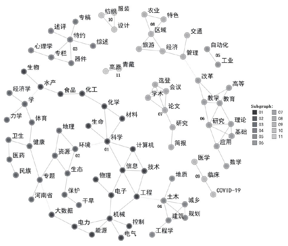 文章采用文本分析法,研究我国高校学报自然科学版栏目的设置情况,为学报栏目规范化提供建议。利用KH Coder软件对栏目名称进行高频词统计、词间关系抽取与文本插值聚类分析,并可视化展示其语义关系,探讨栏目名称的命名特点及其学科归属。栏目名称中的高频词反映出期刊栏目设置多样,但栏目命名随意性较强;语义网络体现栏目的命名方式和期刊特色;聚类分析表明栏目名称的自然科学学科归属不强,学科交叉突出;部分学报的栏目设置超出其学科范围。我国高校学报自然科学版的栏目设置及其命名尚未考虑其规范性,期刊应重视栏目和名称的合理设置,规范其学科属性。