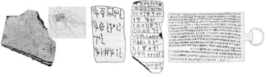 导致直排退出舞台的原因源于西方文字最重要的一次变革—由表意转为表音。早期复杂的象形图符被简化成楔形符号。公元前1 900年之前,大部分符号在书写中突然好像向左翻倒了一样,转了90º,书写方向也改变了:文本不再像原来那样从右向左竖行书写,而是分栏从左向右横向书写。[4]没有确切的证据说明这种变化的原因,可能是书写者为了便利而做的改革。以后出现的各种表音文字都为横排,但各地区没有统一的方向性,有的从右向左,也有的从左向右(见图3)。