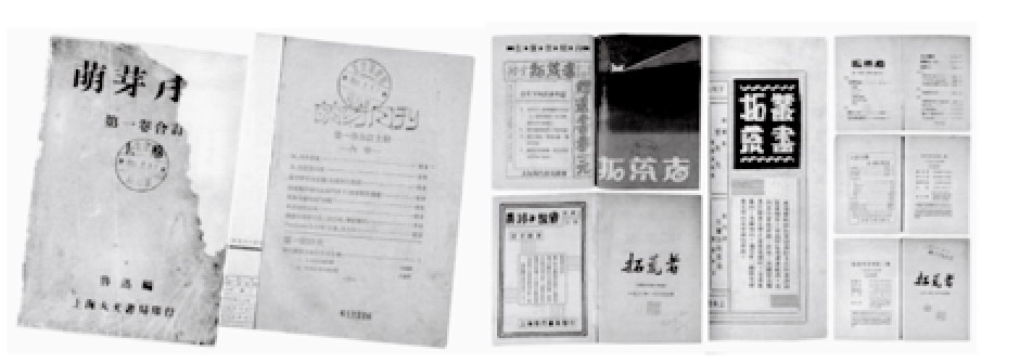 一些新文化思想激进者主办的杂志里也出现横排。如1919年北京大学创办的学术刊物《北京大学月刊》,1922年由郭沫若主持的创造社社刊《创造》从第2期开始也改为横排。 "左联" 创办的刊物,1930年鲁迅、冯雪峰主编的《萌芽月刊》,蒋光慈主编的《拓荒者》均采用横排。此外,1931年3月创刊的《青年界》也同样采用横排的方式编排内文。这些杂志以迎合西方科学新思想的姿态首先作出积极应变。(见图10)