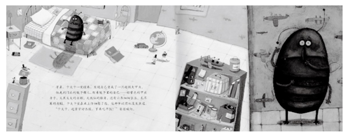 其一,视觉轴线作为叙事线索连接着读者和角色,以角色获得读者的注意力,从而代入角色的视角和所处情境,随着翻阅行为沿着作者设计的视觉轴线进入故事情节。比如《卡夫卡变虫记》中的第1幅跨页画面(见图1),左图是卡夫卡变虫后的全景画面,右图是对卡夫卡恐慌表情的特写,类似镜头运动,用一条横向的视觉轴线将读者阅读由卡夫卡变虫的现实深入到不安的内心世界,读者自然地被引入后面卡夫卡变虫后的各种情景。