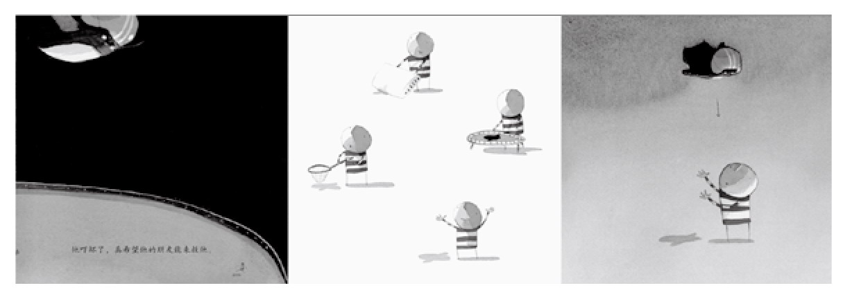 电子绘本的设计保留了 "静态" 和 "翻阅" 的绘本特质。在此之上,我们借鉴了电影镜头运动、蒙太奇和声画关系,试图探索数字媒体处理视觉轴线、画面结构和文字配音的独特方式。在这里,虽然画面仍是静态的,但镜头式的视觉轴线和组接方式上的蒙太奇式结构使每个画面不孤立存在,与它相连的画面形成关联,产生新的语义。并以数字媒体特有的淡、化、切、推、拉、闪等转场方式连接画面,暗含着回忆、情绪等不同的画面关系,以及连贯、排比、反衬等不同的艺术效果。