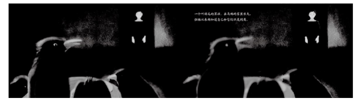 纸媒绘本开篇通常采用特写(见图1)、弱化场景(见图4)或设计构图中主角的位置(见图5)等方式将读者注意力吸引到主人公身上。在这里我们采用了更直接的方式。首先以静态的全景画面交代故事背景,再模拟镜头的失焦效果模糊掉房间场景,只清楚地显示主人公羽毛,促动读者进入情节,并对角色产生情感上的认同(见图6)。第2张画面再放置特写画面,符合读者的心理预期,显得流畅自然。