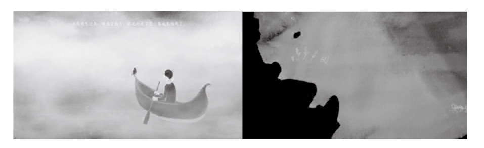 对于较大画幅的视觉轴线,纸媒绘本多采用跨页设计或立体层展开的方式,如《小鸡球球》成长系列绘本。在数字媒体中,我们通过模拟移镜头或跟镜头的效果展开画面(见图7)。比如羽毛划船离家寻找世界、一路风雨的设计,用一幅连续的长卷展现其在海上的漂泊历程。主人公不动,场景画面在屏幕中横向移过,类似跟拍的效果,以此来弥补数字媒体无法通过折页展开画幅的不足。