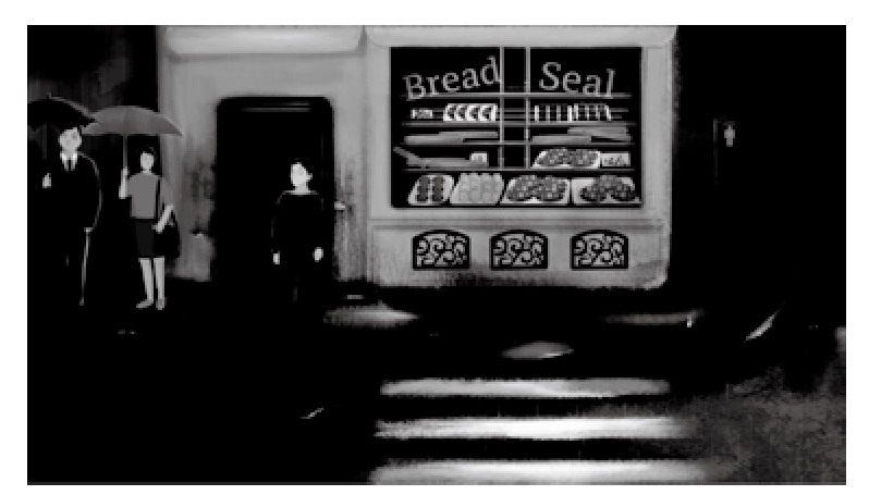 对于主人公的心理描绘则借鉴了表现蒙太奇的结构,比如在羽毛划船出走时,内心既期待又紧张,这时以抒情蒙太奇的方式,淡出淡入地切入象征羽毛情绪的空镜头—水面下忽上忽下悬浮着水草(见图8)。而主人公在面包房前不知如何得到食物时,以模拟推镜头的方式将画面中的他推进到特写,再用闪白的连接方式穿插了家中晚餐的场景画面(见图9),象征着羽毛主观的内心闪念。想象中的3个场景在时间上没有先后次序、在情节上没有呈递关系,采用了类似并列镜头的处理手法,以无技巧剪辑快速切换画面。在雨中,为了凸显羽毛的孤独无助感,用俯拍镜头的方式,表现了很多举着雨伞的行人和羽毛孤身一人淋着雨的对比,为绘本最后羽毛看到亲人后的情感爆发作以铺垫。