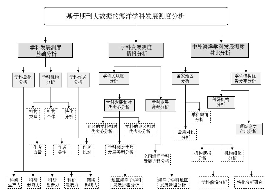 本文基于期刊大数据研究方法,以海洋学科为例,研究海洋学科及其各子学科的科研力、发展相对优势及发展进程、地区和区域发展、中外发展比较等,为海洋学科发展提供学术支撑,为期刊大数据研究和出版科技发展提供实证分析。基于期刊大数据的学科发展测度研究结构框架见图1。