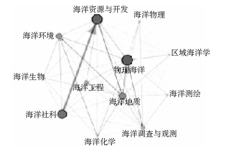根据中国引文数据库,利用2005—2014年海洋各子学科论文之间的引用和被引关系,产生海洋专业学科间相互引用关系,见图2。其中,箭头指向为被引文章,线越粗表示该学科被引用的次数越多。学科发展关联图将学科间相互关系可视化,使学科之间的相互联系和交叉融合情况直观明晰。