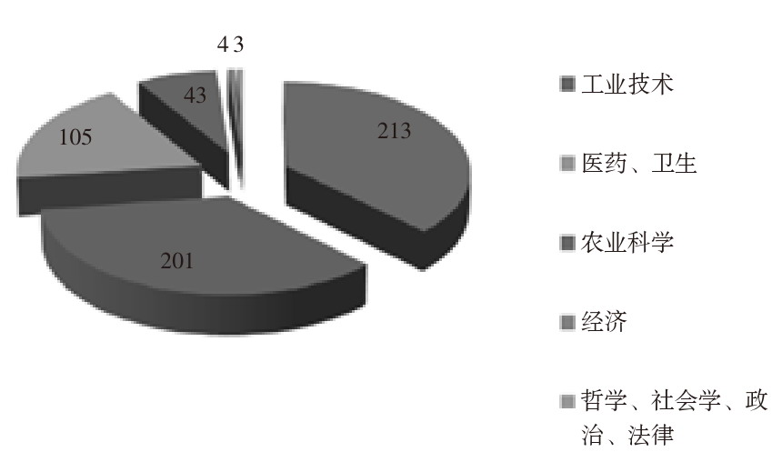 按照《中国图书馆分类法》(第五版),CSAD数据库收录的论文文摘几乎涵盖了所有的一级学科分类。其中,以工业技术,医药、卫生,数理科学和化学,农业科学,天文学、地球科学等自然科学为主。列前5位的学科收录论文文摘量占总收录论文文摘量的79.49%,占文摘收录的绝大部分。工业技术是收录量最多的一级分类,占了总收录量的1/3以上,其次是医药、卫生类,占18.09%,如图2所示。