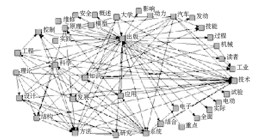 技术科学领域包含交通运输和工业技术这2类图书,2016年提取的技术科学领域图书的书目样本是568种,其中交通运输为224种,工业技术为344种。分别将纯文本数据导入 ROST Content Mining,在剔除无意义词后得到高频词表(分别参见表4和表5)和语义网络图(分别参见图3和图4)。综合图表数据,可以发现技术科学领域的2大类图书除具备总体图书的出版特点外还具有其他显著特征。