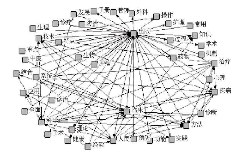 生物科学领域包含医药卫生和生物科学这2类图书,2016年提取的生物科学领域图书的书目样本是571种,其中医药卫生为242种,生物科学为329种。分别将其导入ROST Content Mining,在剔除无意义词后得到高频词表(分别参见表6和表7)和语义网络图(分别参见图5和图6)。综合图表数据,可以发现生物科学领域的2大类图书除具备总体图书的出版特点外还具有其他显著特征。