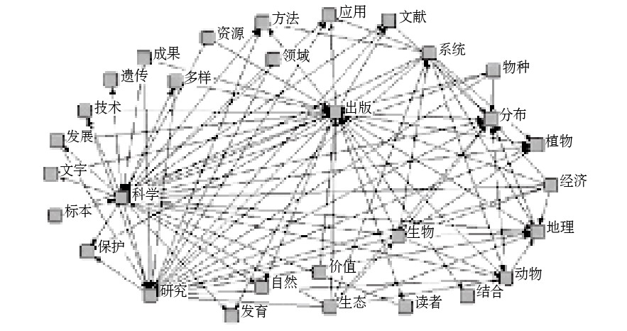 根据中国图书馆图书分类法,本文将自然科学领域的图书按自然科学总论、农业科学、天文地球、航空航天、环科安全、数理化分为6类。将包含这6个类别的2 727个样本的书目信息转化为纯文本后导入ROST Content Mining,在剔除无意义词后得到高频词表(表2)和语义网络图(图2),通过分析相关数据可以发现自然科学领域图书除了具备总体图书出版特点外还具有以下特点。