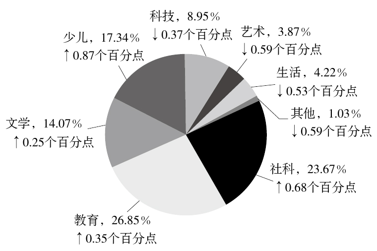 另据“2016上半年全国图书零售市场分析”数据显示,[1]在中文图书销售整体和各细分市场指数方面,社科类图书销量略降,市场指数为102.3点,同比减少13.87%,但在市场指数的各细分市场中仍位列第2。在细分市场的销售码洋和所占份额方面,图书码洋份额超过20%的类别仅有2类,社科类图书同样位列第2,码洋份额占到23.67%;同比增长也位列第2,为0.68%。2016年上半年单品贡献率高于1的图书品类有4类,社科类图书为1.21,位列第4,这也是同比增长最多的类别。以上列出的相关数据显示,2016年人文社科图书出版与读者阅读需求基本吻合,市场表现相对平稳。