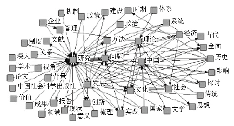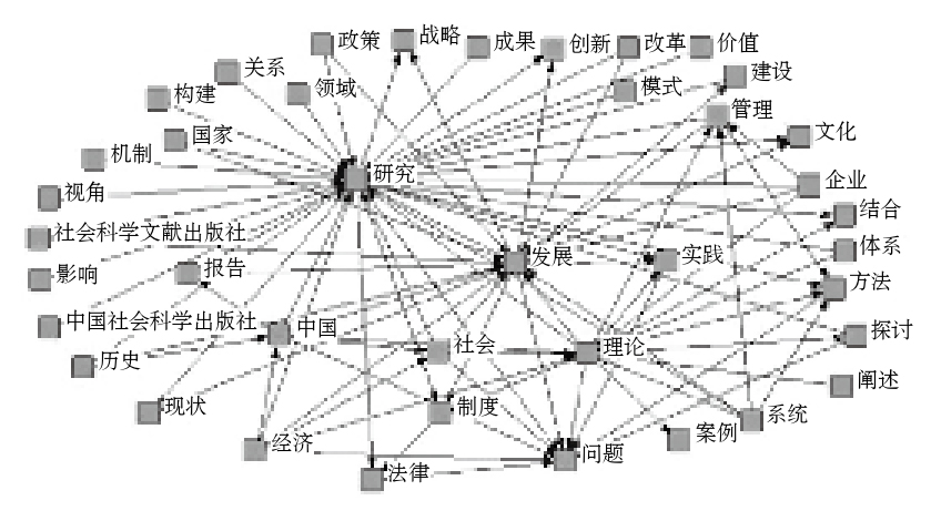 根据中国图书馆图书分类法,社会科学类图书包含马克思主义、列宁主义、毛泽东思想、邓小平理论,社会科学总论,政治法律,经济,军事,文化、科学、教育、体育6个类目。将该领域23 761种样本图书的书目信息转换为纯文本文件后导入ROST Content Mining中分析,经过过滤和剔除无意义词后得到表2所示的高频词表和图2所示的语义网络。分析发现社会科学领域图书在满足总体图书出版的特点后,还具有以下特点。