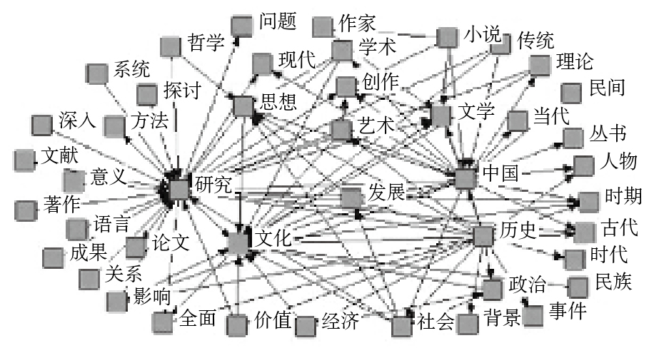 根据中国图书馆图书分类法,艺术与人文科学类图书包含哲学宗教、语言文字、文学、艺术、历史地理5个类目。将该领域27 664种样本图书的书目信息转换为纯文本文件后导入ROST Content Mining中进行分析,经过过滤和剔除无意义词后得到表4所示的高频词表和图4所示的语义网络。分析发现艺术与人文科学领域图书在满足总体图书出版的特点后,还具有以下特点。