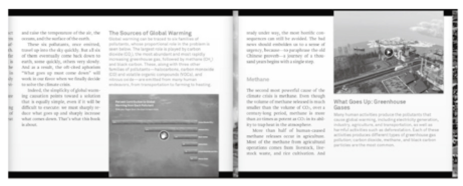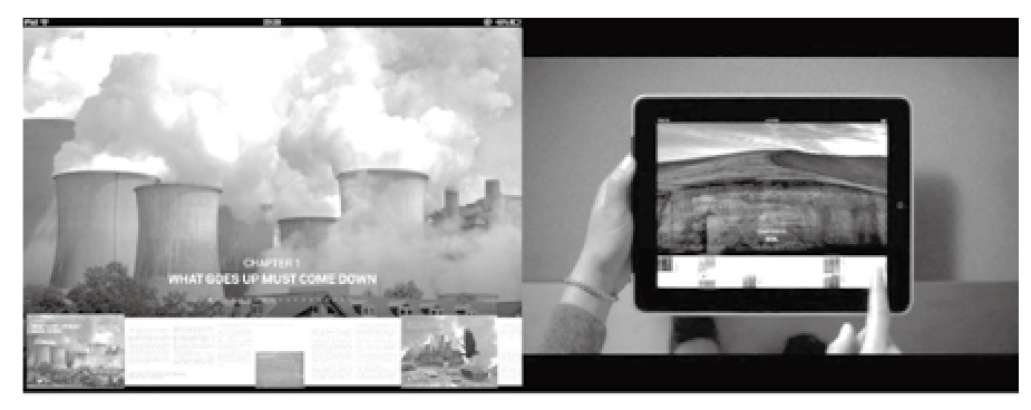 有的电子出版物会为读者提供一份使用说明,告诉读者在阅读时应该如何操作,但设计说明同样需要花时间去阅读、花精力去记忆。而好的设计本身就具有说明的作用,用户只要看到这件产品,通过它的形态就可以判断出其操作方式。比如可以根据外观来判断收音机上的按钮哪个是可以按下的、哪个是可以拔起的、哪个是可以旋转的。在电子出版物中,设计元素的形态同样可以起到类似的启示作用。如图4所示,左图中的抓手图标示意读者,这是一幅可交互操作的动态信息图表。右图中的播放图标则表示该缩略图放大后为播放的视频。类似的启示有很多,设计元素是会说话的,它可以召唤读者进行某项操作,从而实现某个目的。比如当读者将手划过页面的右下角时,页面出现轻微的卷边,那么读者就能够知道这样是可以翻页的。