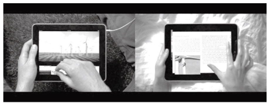 如图6所示,以平板电脑作为阅读的工具,将手指按在页角上并向左上方拖动,虚拟的纸张就会随之翻开,这一操作方式和视觉效果都与传统的阅读相似,读者在以往阅读经验的基础上,可以轻而易举地完成这一操作。