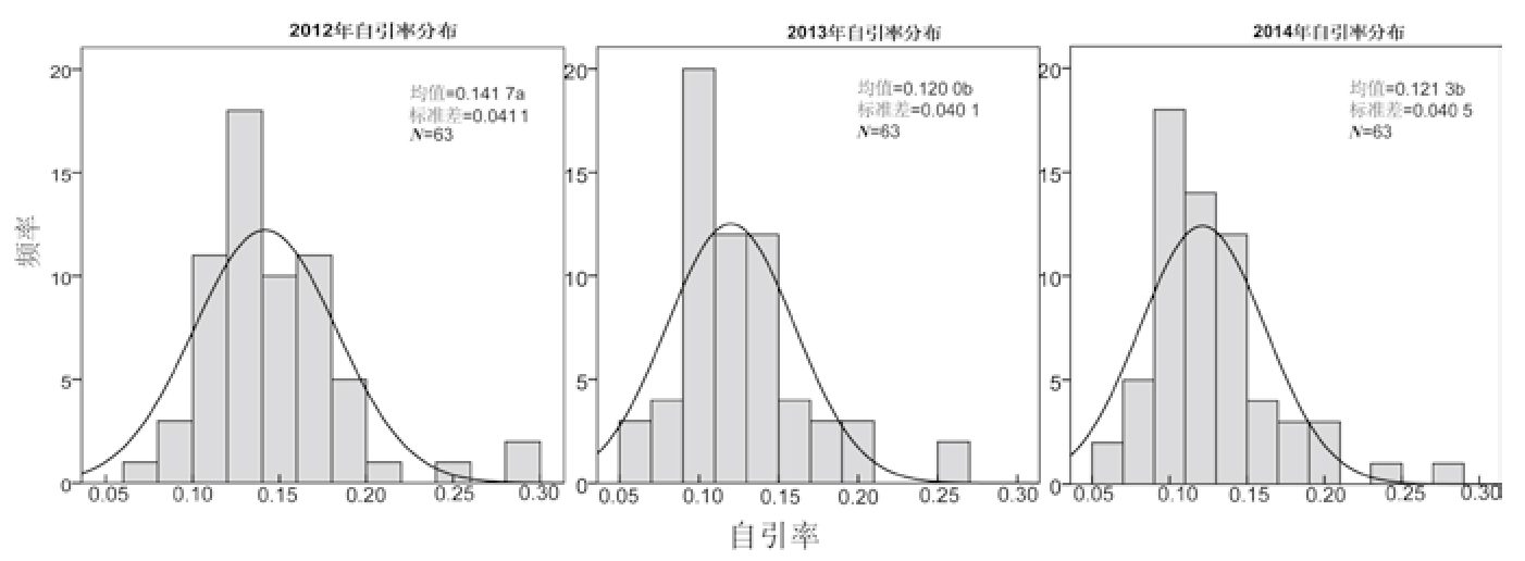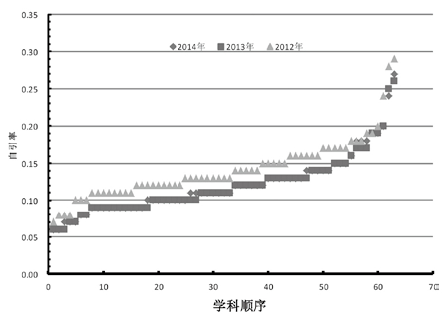 期刊的自引体现了期刊刊发文章的一种连续性,同时也反映了作者在科学研究中的进展水平和动态,通过自引可以定量地考察学者的著述动态和征兆[5]。然而,目前有个别期刊为了提高影响因子,过分地进行自引,造成了期刊不合理的自引现象。因此在对期刊进行评价时,应将自引率控制在合适程度。目前认为自引率超过20%即发生了过度自引[7],这种将所有学科期刊自引控制在一个固定值的现象,掩盖了不同学科自身的特点。由2012—2014年中国知网《中国学术期刊影响因子年报》所涉及的我国63个学科、4 000种左右的期刊自引率与学科的关系可以看出,2012—2014年63个学科期刊平均自引率存在较大的差异性,主要分布在0.05~0.20之间,且学科期刊平均自引率的频次分别符合正态分布,这也许就是使用固定值作为评定期刊过度自引的统计学基础[6]。但在考察我国不同学科期刊3个统计年的自引率时发现,2012统计年时63个学科期刊平均自引率与2013和2014统计年存在明显差异,这种差异是否是由2012年不同学科期刊数量造成的还有待进一步研究,但是这也体现了平均学科期刊自引率年变化的特点。