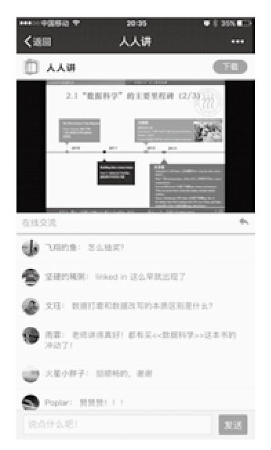 还有一些出版社已经不局限于将直播作为宣传的一种手段,而是利用出版社原有的优势资源,不断挖掘内容生产,寻找垂直类内容的交互模式和变现模式。这种PGC(专业生成内容)直播模式正逐渐被出版社认可,成为未来直播的发展方向。例如,中信出版集团联合优酷、土豆推出一档文化垂直类直播栏目—中信“大集”知识Show,集科技、经济、社会、人文、历史、艺术等内容于一体。这种类型的直播最重要的目标是创建栏目的品牌和口碑,有一定流量且具有媒体属性的直播平台是首选。
