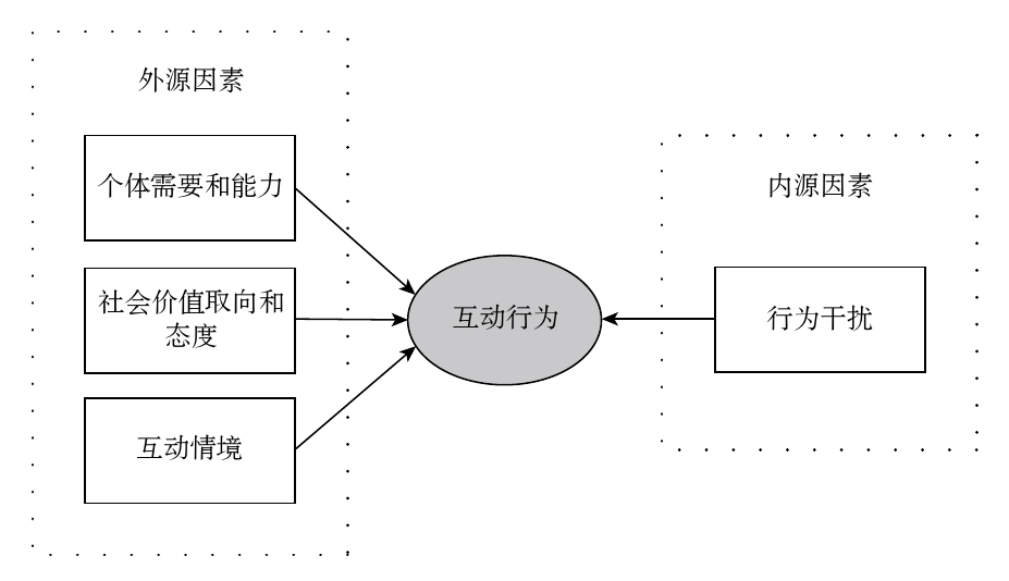 其中个体的需要主要包括自我表达、个人发展、实用动机和享乐、社会归属、利他、互惠和声誉等。个体能力是指个体通常会选择具有某种能力的互动对象,这种能力能带来更多的报酬。社会价值取向和态度是指具有相似价值观和态度倾向的个体更容易彼此选择作为互动对象。互动情境主要包括物理接近和资源互补两方面,物理接近是针对现实社会中互动双方之间的空间距离,资源互补是指互动双方每一方能够提供给对方所需要而对方本人又难以实现的资源。在互动过程中,行为干扰一般以两种方式出现,一种是A方表现出来的行为干扰B 方对某一特定行为的表现过程,另一种是A 方表现出的行为干扰B 方对其行为结果的评价,或者阻碍B 方获取行为报酬。