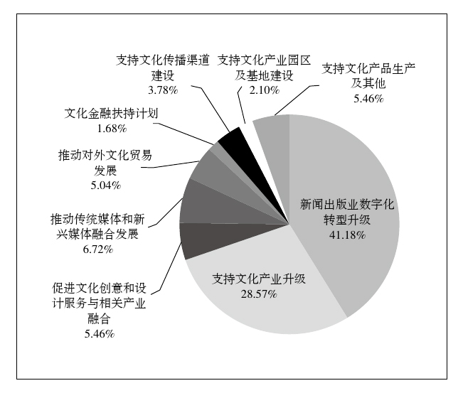 根据新闻出版改革发展项目库显示,2 015个项目中目前结项项目共14项,未启动项目280项,正在进行的项目有1 721项。在资料收集与研究过程中发现,项目库中显示的项目进展信息更新延时情况较多,且超过一半的项目无法通过网络检索获得公开信息,这对研究产生了较大影响。从现有的信息来看,以“产品”为最终成果的项目进展较为良好,例如图书出版、基地建设、动漫游戏制作、数据库和数字平台的搭建等。涉及技术开发与数字出版的项目,以及一些大型建设性项目进展均较为缓慢。文化产业发展专项资金将项目与资金支持直接挂钩,这些项目相较于项目库中的项目更加精品,且由于直接接受财政支持,这些项目的实施也更加顺利。但是与项目库同样的问题是信息不公开,超过一半项目无法通过公开渠道获得进展信息。