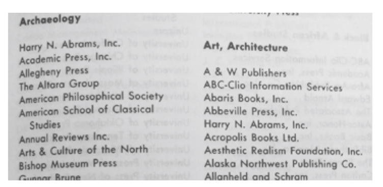 图1是PTLA主题索引的一个截面,显示有关出版考古学(Archaeology)和建筑艺术(Art,Architecture)方面出版物的部分出版商的名称。