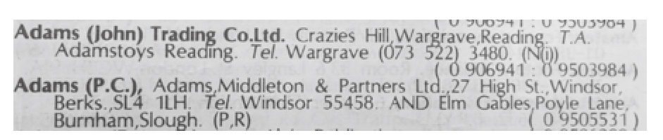 实际上除了美国外,其他许多英语国家的出版社也有学科分工的惯例。英国的在版书目(British Books in Print,简称BBIP)中的“出版商列表”(List of Publishers)就以代码表来表达出版商的分工,比如图2中名为Adams (John) Trading Co. Ltd出版商的学科领域主要是“儿童普通读物”(图中出版商介绍栏目最后的代码N(i),通过代码表查得具体信息为:Children’s Books—General);而另一个出版商Adams (P.C.)则出版体育和历史方面的读物,因为表示这个出版商出版物分类的代码P指“运动,游戏,消遣类”(Sports, Games and Pastimes);R指“历史,考古和传记类”(History, Archaeology, Biography and Memoirs)。