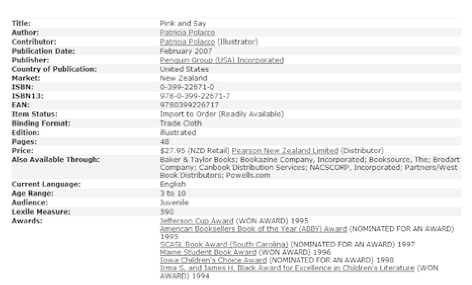 阅读材料也是分级别的,美国网络版《图书在版目录》标注有蓝思阅读分级。图4中的这本题名为“Pink and Say”的图书阅读级别为蓝思590 L。美国亚马逊网站的部分出版信息中也包括蓝思分级,如《神奇校车—在人体中游览》一书的蓝思分级为520L,《神奇校车—迷失在太阳系》的蓝思分级只有480L,而《哈利波特—魔法石》的蓝思分级则达到880L。