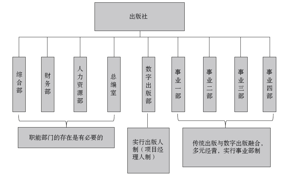 几十年来,中小出版社为我国出版业的发展和繁荣做出了很大贡献,最大限度满足读者需求,获得了良好的社会效益和经济效益。然而由于体制和历史原因,传统的中小出版社在组织结构和业务流程等方面存在诸多问题,其经营、管理及发展可谓有苦难言,困难重重。当前,大部分传统的中小出版社都是“编、印、发”一条龙的直线型业务流程模式,管理上形成了直线职能型组织结构,在目标明确而持久、分工明确、管理简单、技术相对稳定的情况下,这种模式发挥着其独有的优势,很大程度上提高管理工作的效率,保证出版物质量,满足了市场需求。然而,随着市场经济和新技术的发展,中小出版社的内部及外部环境都发生了根本的变化,特别是传统出版和新兴出版的融合发展,带动了多元经营,而当前单一的、集权的组织结构阻碍了出版社的发展。出版社人员的组织和管理仍依照编辑出版的生产环节和步骤进行,组织结构分成编辑部、发行部、出版部等各职能部门,同时还设立总编室、财务部、人力资源部等辅助部门,以各职能部门组合实现整体功能,编辑等各类型人员的组织和管理围绕具体的工作职能进行,各类型人员的工作是通过部门职能衔接,这种“一条龙”的流程模式、直线职能型组织结构存在的问题如下:
