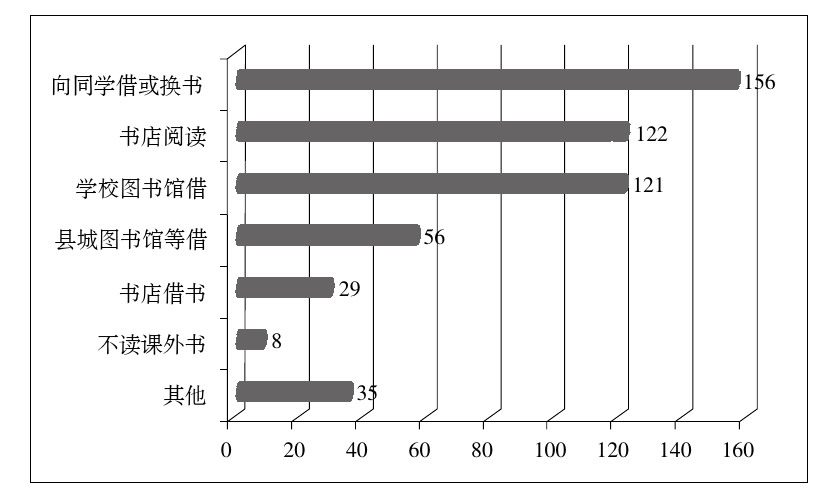 下图是对课外书来源的调查统计,除了购买课外书,同学间的换书或借书是图书交流的最主要渠道,超过了在图书馆借书,更远大于在县城图书馆或农家书屋借书,可见县城图书馆的使用率不高。