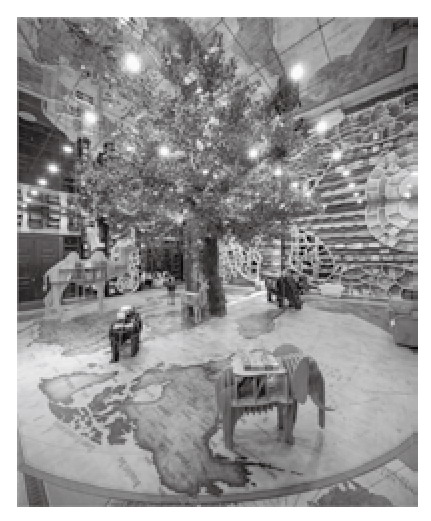在上海钟书阁,二期建筑与一期建筑连接在一起,两个空间由一条更加宽阔的读书连廊连接。走入钟书阁,设计师把书架从一边墙壁延续到空中再从另一边的墙壁落下,形成了一个殿堂般的拱形书籍空间,神圣感油然而生。离开色调深沉、文化浓郁的中央阅读博物馆区,慢慢走向书店的深处,突然出现色彩斑斓、炫丽梦幻的一处空间,这是钟书阁专为小读者们打造的绚丽童书馆(如图4)。这里以一棵勃勃生机的大树为视觉中心,以“梦幻动物园”为主题,利用绚丽的色彩和小动物书架装饰墙面,每一个元素的设计都充满了童真和快乐。地面画有地图,站立着代表不同大洲上的各种动物模型,栩栩如生,这些动物也是书架。在灯光的衬托下,童书馆更像是一个梦幻的游乐园,孩子们在这里尽情地感受着各种童真与乐趣。通过书架楼梯来到二楼,这里没有整齐排列的书架,只有高低错落的竹木书卷将人包围,时光仿佛倒流。步入书卷之林,设计师将顶棚设计成梦幻的星空和若隐若现的星辰,神秘而庄严。在钟书阁,设计师用丰富的设计手法演绎着书的精神世界,用独特的设计风格为读者打造了一个又一个梦幻的读书场景。[8]