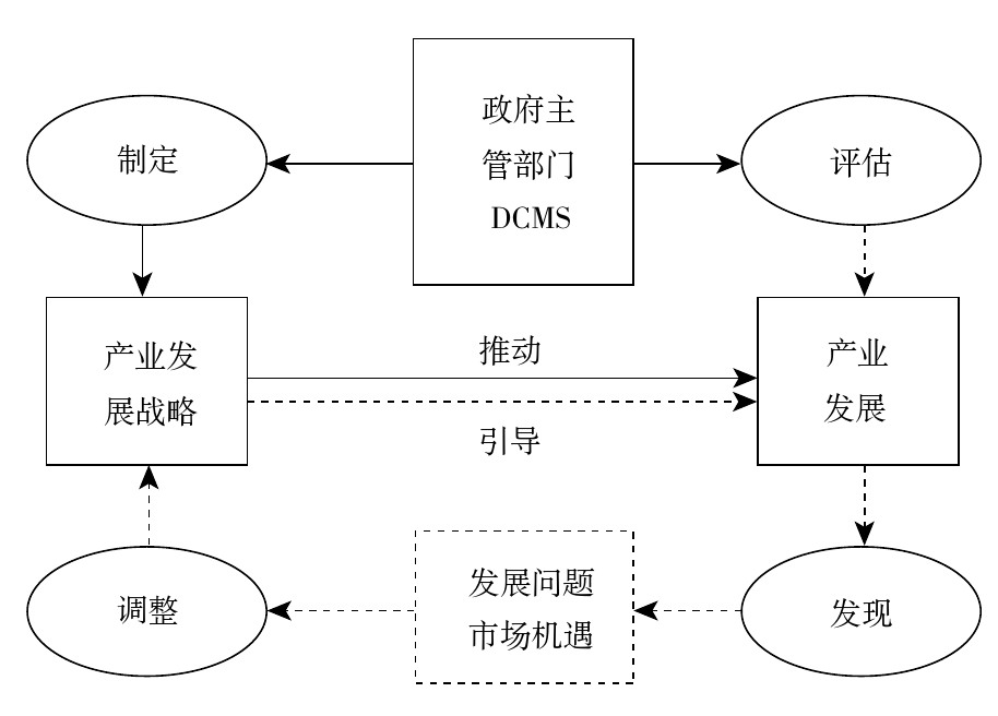 基于长期的评估,实现了对产业发展情况的实时监测,明确了引导产业健康发展的具体路径。同时,政府主管机关可以及时发现产业发展中的困境与机遇,及时对具有发展潜力的产业领域进行引导与扶持,将发现的机遇转为引导产业发展的动力,并对面临发展困境的产业领域进行改进与优化。例如,因为在几年的产业评估中,软件产业的发展逐渐成了推动版权产业发展的主要动力,因此在最新版本的英国《产业发展报告》中,软件产业就被明确作为未来3年主要的版权产业发展方向。经过分析可以发现,在产业发展的过程中,政府主管机关扮演了非常重要的角色。其在宏观层面制定产业发展战略的同时,通过产业发展评估的途径,实现了对产业发展方向的引导(具体运行机制如图1所示),使得版权产业的发展能够不断进行调整与完善,为英国国民经济的发展提供持续动力。