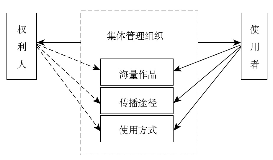 “作品”是版权产业发展的基本载体,而全新的传播技术不仅赋予了作品创作者诸多全新的权能,也丰富了作品使用者获得与使用作品的途径,还改变了作品传播者利用作品的方式。以互联网的出现为代表的信息技术发展,为英国版权产业发展战略的实施提供了历史机遇,但机遇与挑战通常相伴而来,信息技术的变革为传统的“权利人—使用者”交易模式带来极大挑战。一方面,在面对海量的作品时,使用者与权利人逐一通过谈判的方式进行交易已经难以实现;另一方面,在作品纷繁复杂的使用与传播方式面前,权利人已无法全面掌控作品的使用情况。于是传统的交易模式因其交易成本的增加、交易效率的降低,已经无法保证作品有序与高效的流通,难以支持产业的快速发展。在这一背景下,以集体管理组织为代表的中介组织,在产业发展过程中所发挥的作用愈发显著。所谓集体管理是指:版权(著作权)集体管理组织经权利人授权,集中行使权利人的有关权利并以自己的名义进行的特定活动。对于版权产业而言,集体管理组织最为关键的作用在于将原有市场交易过程中,作品权利人与使用者之间一对一的直接交易模式,转变为集体管理组织与权利人和使用者之间一对多的间接交易模式。这一模式在海量作品和诸多使用方式共存的情况下能够有效降低权利人行使权利与使用者获取作品授权的成本,提高了交易效率的同时,降低了交易风险与成本,符合著作权人和使用者的共同利益(相关原理如图2所示)。