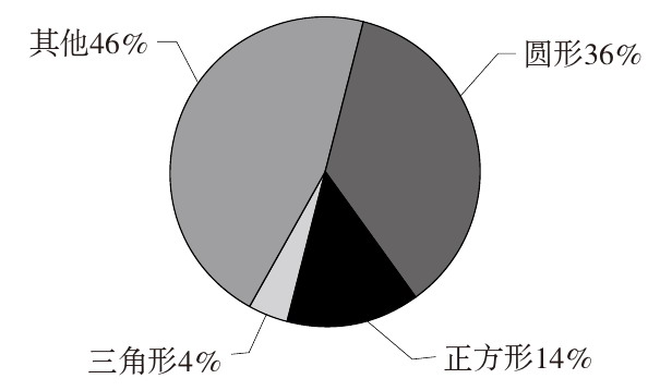 以中国新闻出版研究院近三年发布的《新闻出版产业分析报告》中出版社总体经济规模排名数据为依据,将80家出版社品牌视觉形象从造型和色彩两个角度进行分析。除去出版社名称文字部分外,从整体社标造型角度来看,大部分出版社视觉形象外形以圆形、正方形、三角形等几何形为主,其中采用圆形为主要品牌视觉造型占比36%,采用正方形为主要品牌视觉造型占比14%,采用三角形为主要品牌视觉造型占比4%,采用其他造型(具象形等)为主要品牌视觉造型占比46%(见图1)。