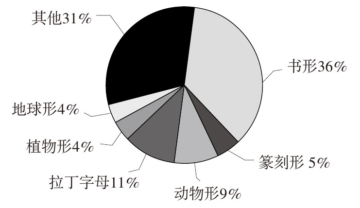 从出版社品牌视觉形象核心图形要素角度分析,发现在图形中大量采用了图书形、植物形、动物形、篆刻形、地球形以及拉丁字母等形象,其中采用书形占比36%,采用动物形占比9%,采用植物形占比4%,采用汉字形占比5%,采用地球形占比4%,采用拉丁字母占比11%,采用其他类型图形要素占比31%。(如图2)