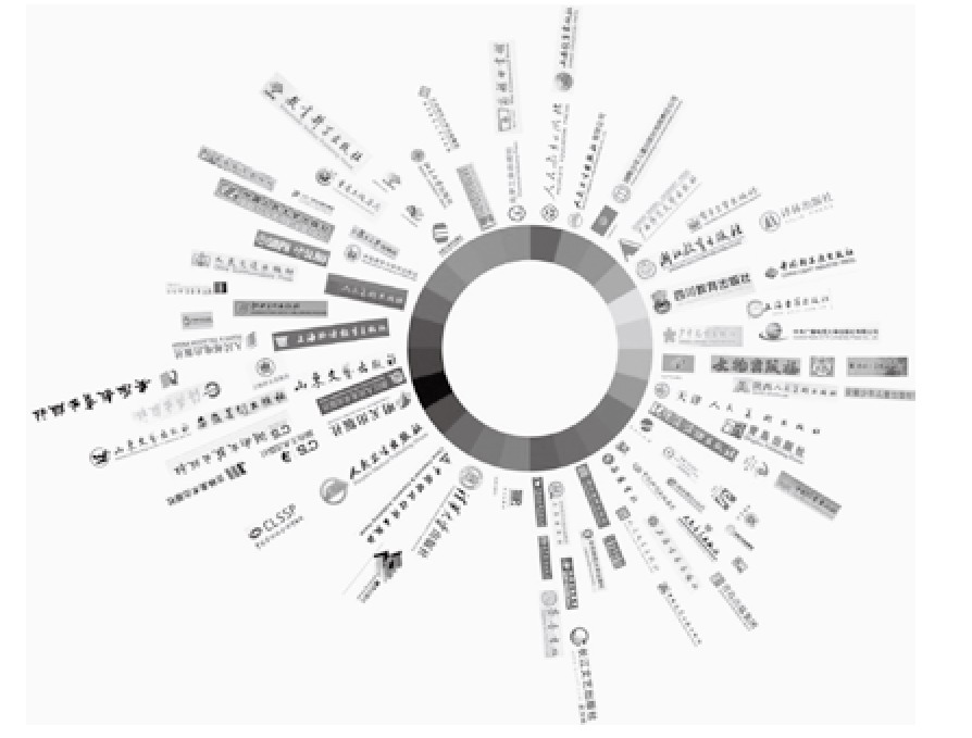 品牌色彩是比图形更能引起受众共同审美感受的符号要素,品牌色彩通过心理联想与图形发生联系,并与一定的图形形成了约定俗成的象征观念。选取80家出版社品牌视觉形象主色作为样本,以色相环作为色彩分析的依据,因为出版社品牌视觉形象的主色一般纯度都较高,所以不考虑纯度的差异,而在外围增加了三阶的明度区域,越往外越暗,这样可以看出品牌视觉形象标准图形色彩的层级。色相环分析法通过对不同类型出版社的品牌视觉形象色彩系统的采样对比分析,可知红、蓝、绿色相系是采用度最高的色彩区域,相比之下,黑、紫、洋红色相则采用度较低,国有出版社采用的色彩大都明度中等,色彩倾向稳重。一些具有创新意识的出版社在品牌色彩里有的同时增加了同类色、对比色的渐变以丰富色彩关系,形成色彩对比获得视觉冲击力(已成为流行方式)。其中,出版社使用一种品牌色彩的占比31%,其优势是轮廓清晰、明确有力,易于推广制作;使用两种品牌色彩的占比66%,达到半数以上;使用3种及以上品牌色彩的出版社标志仅占3%,由于三种及以上的品牌色彩,整体性不够突出,处理不妥,容易造成视觉上的模糊。