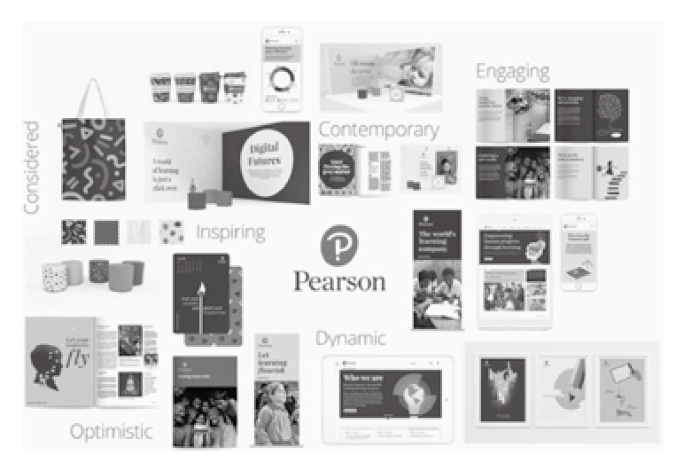 国外出版社在品牌标准色和辅助色的使用上与国内稍有差别,开始由大胆醒目的纯色调转向了略带优雅娴静的灰调,使用数量上多以一到两个色相为主。例如励德•爱思维尔(Reed Elsevier)公司直接在品牌核心图形上采用大面积单色黑配以小面积英文字母部分的橙色,再如培生教育出版集团新品牌标准色有中性色调的蓝色,辅助色则使用粉白、石灰绿、冰蓝、深蓝、石墨灰5种颜色相结合,呈现出的蓝灰调给人以沉稳持重的视觉感受,能够在同行竞争中脱颖而出。