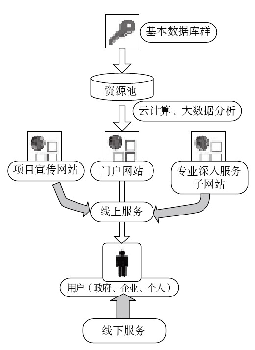 本平台总体架构分为三个层级、两个支撑、一个门户。以法律法规、政策服务系统为例,如图2所示。