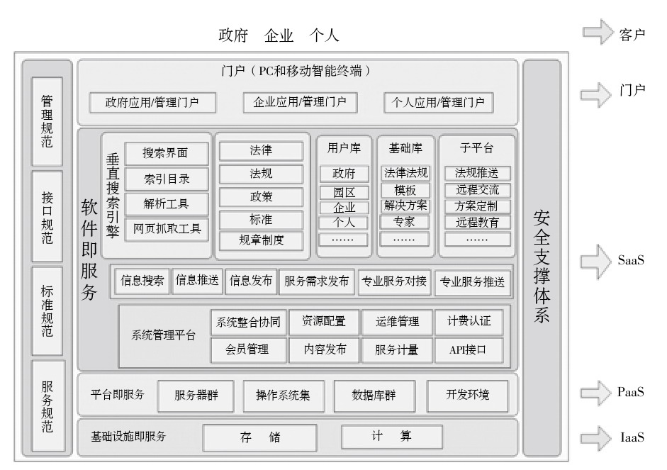 系统基于云计算架构构建,整体结构分为IaaS(基础设施即服务)、PaaS(平台即服务)和SaaS(软件运营服务模式)3个层级。其中IaaS、PaaS层拟应用第三方提供的存储、计算、开发环境等服务,SaaS层的云计算管理平台软件、政策精准搜索引擎、各类政策分析工具、各类基础数据库,以及向第三方用户提供开放的API接口。