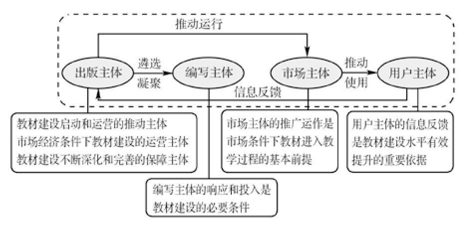 大工社基于对高职教材建设理念的深刻认知及对教材编写目标实现路径的理性分析,提出教材出版建设工作需要由4个相关主体协同推动实现:一是出版主体,它是高职教材建设启动和运营的推动主体、市场经济条件下教材建设的运营主体以及教材建设不断深化完善的保障主体;二是编写主体,它是高职教材出版建设的核心力量,是确保教材出版保持高水准并有可能推进到极致的基本依托;三是市场主体,它的推广运作是市场经济条件下促进教材进入教学过程的基本前提;四是用户主体,它是高职教材的“最终顾客”,其信息反馈是教材不断修订完善的重要依据[7]。这4大主体之间相互依存、互相促进,其有效协作、周而复始的完整循环过程是高职教材的知识水平和出版质量的根本保证。教材建设4大主体力量关系如图1所示。