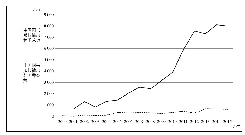 根据国家版权局及国家统计局资料[3]分析处理可知,2000年以来,中国图书版权输出虽然偶尔有小幅的波动,但是总体呈上升趋势,中国版权输出从2000年的628种,到2015年的7 998种,10余年间增长了约12.72倍,特别是2008—2012年的5年,中国的图书版权输出呈现大幅度的增长,如图1所示。中国对韩国的图书版权输出情况虽总体仍旧不断上升,但幅度不明显,且有一定的波动。2010年后,增长缓慢,除2012年有大幅回落之外,均保持稳定的水平。中国图书的版权输出近几年来发展迅速,但输出韩国的图书版权发展相对缓慢,没能跟上中国图书版权输出总体的大幅发展趋势。