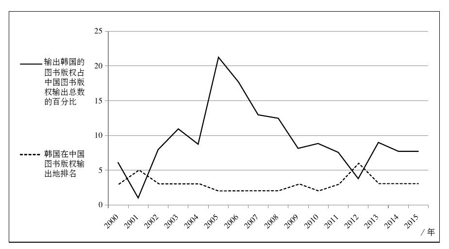 在中国图书版权输出地中,韩国始终保持着重要的位置,图书版权输出的数量基本稳定排在前3位,如图2所示。韩国图书版权输出的数量所占比率浮动较大,最高时曾超过20%,但整体平均在7%左右。2002年起所占比率大幅度上升,到2006年之后又逐年下降,2015年在7%左右。由此可知,韩国市场对于中国图书版权输出市场来说,是一个极为重要的组成部分。虽然中国图书版权输出不断开拓新市场,但韩国版权输出市场在波动后始终占有相对稳定的份额。