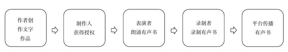 数字有声书在原文字作品的基础上录制而成,中间需经过多次的授权行为。作者创作出文字作品后,通常将录制有声书的权利转让给特定的有声书制作人,由其再组织专门的表演者、录制者,将文字作品转化为有声读物,最后制作完成的有声书由各有声书平台播出,如图1所示。