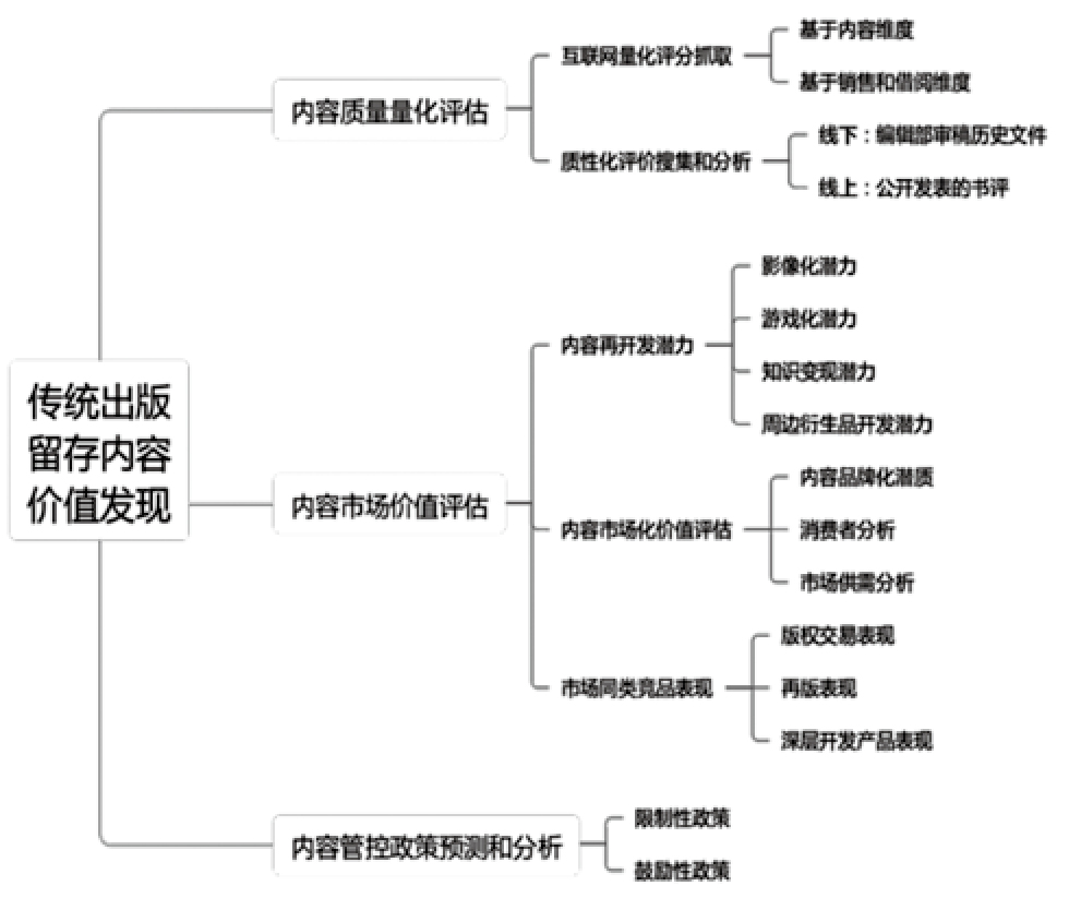 本研究提出了传统出版留存内容激活的基本环节。从数据资产视角出发,从内容质量评估、内容市场价值评估和内容管控政策预测和分析3个维度构建了传统出版留存内容的价值发现体系,并通过国内外典型案例,提出了借助大数据技术进行价值化、功能化、多样化、精准化、连续化、高速化等6种传统出版留存内容的产品化思路。
