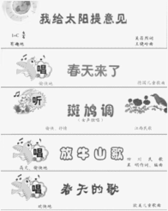 教材的版式设计应该在深入理解各部分内容的基础上,设计出符合小学生视觉和心理逻辑的版式,达到信息概念的传递层次分明、准确合理的效果。图4所示音乐教材中20篇文章的标题毫无章法地用了20种不同的字体和颜色,让人眼花缭乱,既不具备信息的实用性,也不具备美观性,完全没有考虑到书籍的风格应该整体统一。这些匪夷所思随性的版式设计对小学生审美意识会起到误导作用,对视觉元素的不理解会一直困扰着孩子们,影响小学生树立正确的审美观念。