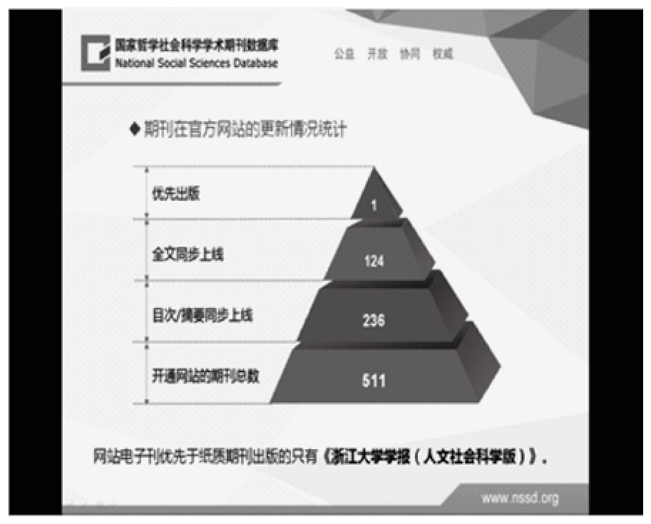 2009年2月,浙大社科学报在自己网站推出首期中文“在线提前版”期刊,同年3月,推出我国中文期刊中首篇以单篇论文为发表模式的“在线优先出版”论文,论文右上角标注数字内容的唯一标识符DOI号,避免与后出的纸本误为不同论文,并建立了我国首个中文优先数字出版网站。自此,优先数字出版带来的革命性变革浸透到学报出版的每一个核心流程,印刷版已成为浙大社科学报网络出版的后续集成行为,所有定稿论文百分之百先于印刷版以单篇的形式在线优先出版成为学报主动性、常态性出版行为。2009年2月到2014年,先后有20多个国家和地区的60多位国际著名学者在浙大社科学报网站优先出版数字论文;十多位海外院士或终身教授主持了15个在线“主题研究”栏目。期间,编辑部还主动联系相关数据机构,积极推动建立中国集成性优先数字出版平台。2011年,中国知网优先数字出版平台正式启动;2012年,万方数据“优先出版知识服务平台”投入运行[4]。