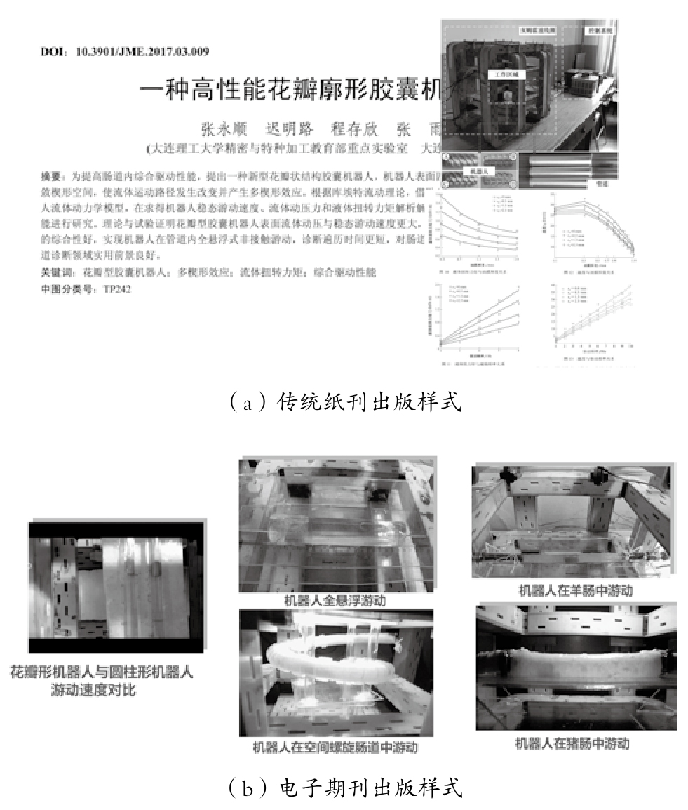 以《机械工程学报》刊登的《一种高性能花瓣廓形胶囊机器人》论文为例(见图2),结合数字化技术,在电子期刊上,我们除了将作者的文字、图片数字化后,还将作者围绕研究胶囊机器人运动的实验过程信息以视频的形式展现出来,让读者真实看到了胶囊机器人在羊肠、猪肠、空间螺旋肠道等环境下游动的情形及不同廓形设计对胶囊机器人运行速度的影响比较。直观的视觉刺激效果远远高于文字的表达。