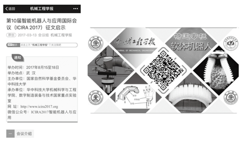 “内容聚合+深入社交”的微信公众平台通过期刊文献信息的深加工,相关资源的再组合,提供符合读者需求的学术信息服务。编辑部微信公众平台目前主要设置了论文推荐、科技论文写作、走近科研团队、高端学术会议报道、专家访谈等栏目。同时,在栏目内容上也注重相互配合。2017年8月编辑部应邀参加由华中科技大学主办的第十届智能机器人与应用国际会议,以该会议为主线,如图3所示,从2017年2月开始,编辑部在微信公众号平台做会议前期预告,6月出版软体机器人专栏,并以专栏形式在微信公众号平台做推广,基本每篇文章都有视频信息和科研团队介绍。8月在会议举办期间,将软体机器人专栏通过微信平台在会场推广,并对会议进行跟踪报道,捕捉会议期间的花絮。会后参观了华中科技大学机械学院,对学院近年来取得的优秀科研成果进行了详细报道。后期我们对软体机器人专栏刊登后的各项数据进行跟踪,数据明显高于同期刊登论文和专栏。